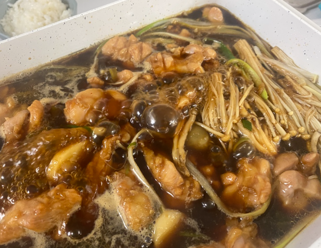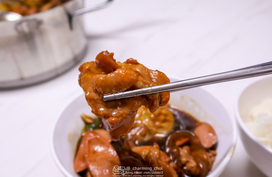 냄비받침은 종류가 두개였는데 랜덤제공이더라고요. 검은사막을 하지않아서 어떤 캐릭터인진 모르겠지만 귀여운 북극곰이라 생각하니 너무 마음에 들어요. ㅎㅎ 포토카드뒤에는 게임에 사용할 수 있는 쿠폰번호와 경품응모권 번호가 기재되어 있어요. 저도 응모를 해보았어요. 개인적으로 게이밍의자를 줬으면 좋겠네요 ㅎㅎ 굿즈 구경하다보니 어느덧 완성된 검은찜닭 부대찌개 햄, 닭고기 양이 어마어마하더라고요.