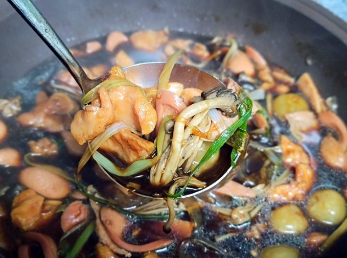 쫄깃쫄깃 옹심이 8개, 햄, 야채, 당면 기본 구성 사리입니다 :D단짠단짠 맛있는 육수!!! 순살 닭튀김 3인분 기준 양이에요. 넉넉하고 푸짐하죠?마지막으로 라면사리까지~~ 달콤 짭조름한 간장베이스 육수의 맛과 순살 닭, 햄의 조합이 계속 당기는 매력~ 의외로 진짜 잘 어울려서 깜짝 놀랐어요. 아이들도 매운맛이 없어서 밥 두 그릇씩 순식간에 해치웠어요! 가성비도 굿.