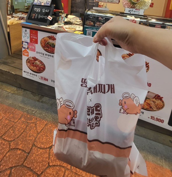 저희 부부는 점심은 회사에서 해결하고 저녁은 보통 체험단 또는 약속이 있어서 주로 외식을 하는 편이기는 하지만 그 어떤 것도 없을 때는 아주 가끔 집에서 밥을 먹는데, 요리를 둘 다 잘 하지 못해서 밀키트를 애용을 한답니다 ㅎㅎ 그중에서도 땅스부대찌개가 집 앞에 있어서 저번에 한번 먹어보니 가격 대비 맛이나 양도 굉장히 괜찮아서 남기는 후기랍니다. 저희는 이번에는 #깡통햄부대찌개 메뉴를 골라서 포장을 해왔는데요. 포장이 구성진 느낌은 아니고 재료들이 일회용 비닐에 소분을 해서 주시더라고요.