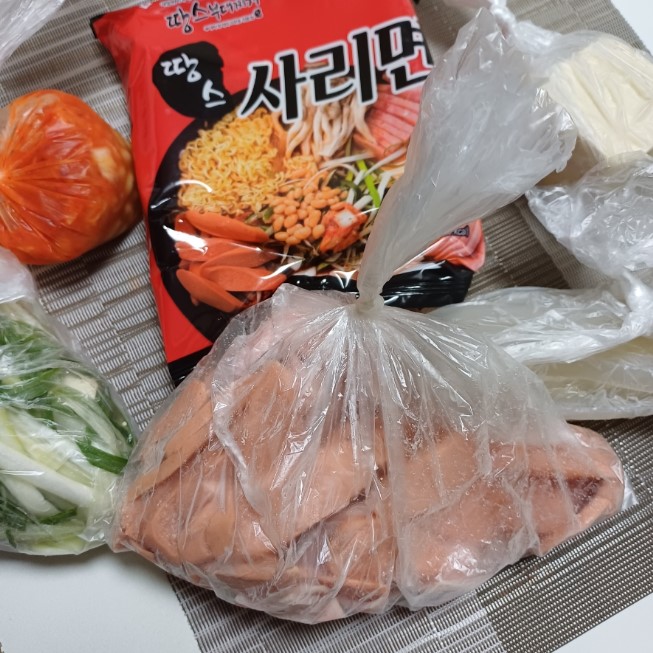 모둠 부대찌개 1 땅스식혜 1 재료들이 소분돼서 봉지에 담겨있어요 당일 손질한 재료라고 하셨고 플라스틱 용기가 아니고 봉지라서 부피도 많이 안 크고 쓰레기 처리하기도 좋았네요 ᄏᄏ 위의 재료를 넣고 끓이면 끝 단짠의 완성으로 식혜까지, 완벽합니다