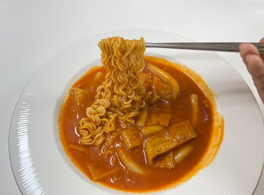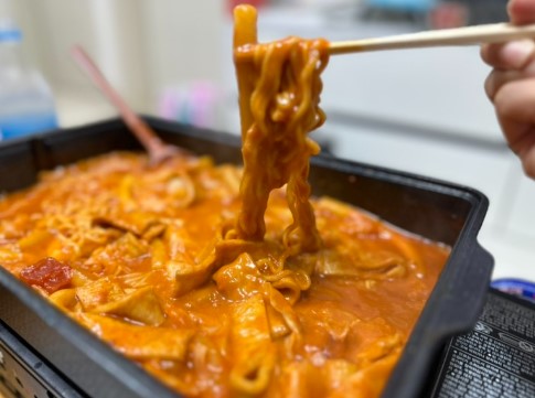 처음 먹어봤는데 생각보다 맛있었어요 음 맛은 약간 토마토스파게티 소스에 떡뽁이 양념이 섞인 느낌? 새로운 느낌인데 생각보다 맛있어서 너무 맛있게 잘 먹었네요 양도 많아서 어디 나들이 갈때 여러명이서 먹기 좋을거 같아요 조리법도 간편하고 완전 강추입니다