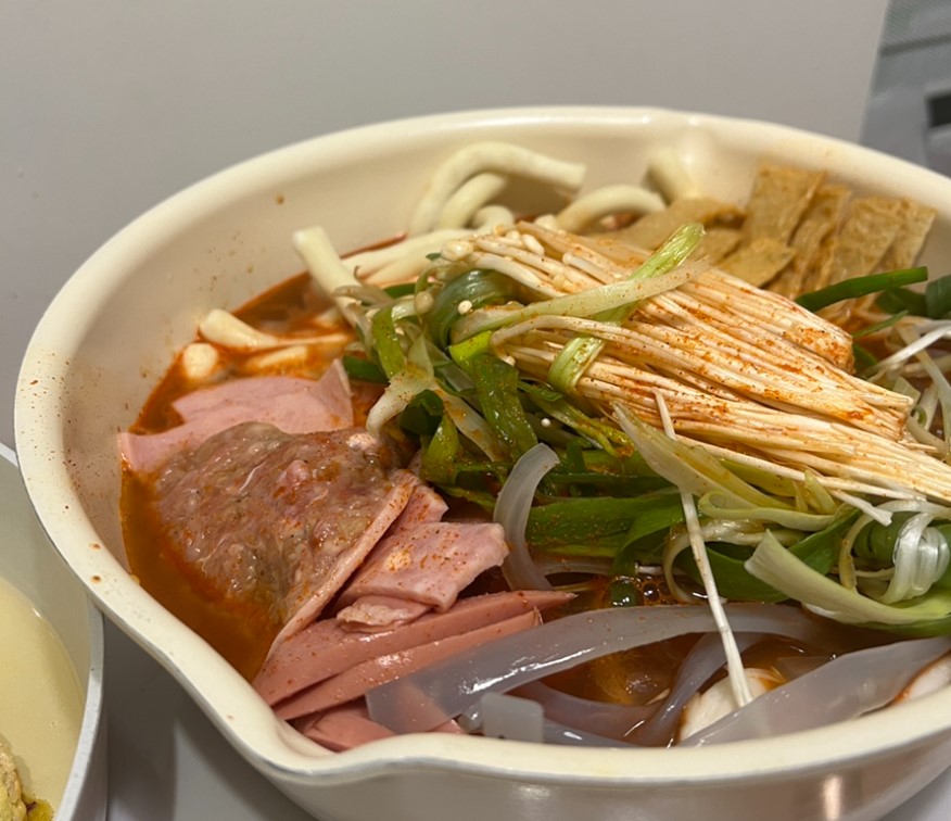 땅스 부대찌개 주문할 때 보통맛과 매운맛 2종류가 있는데 저는 보통맛으로 주문했거든요? 고민을 많이 하는 저를 보신 사장님이 매운맛도 그렇게 맵지 않다고 다음에는 매운맛도 한번 먹어보라고 추천해 주셨어요!!! 만두는 김치만두와 고기만두 2개씩 들어있고 라면사리도 있지만 기본 재료로 제가 좋아하는 당면 사리가 있어서...! 너무 행복한 한 끼였습니다!