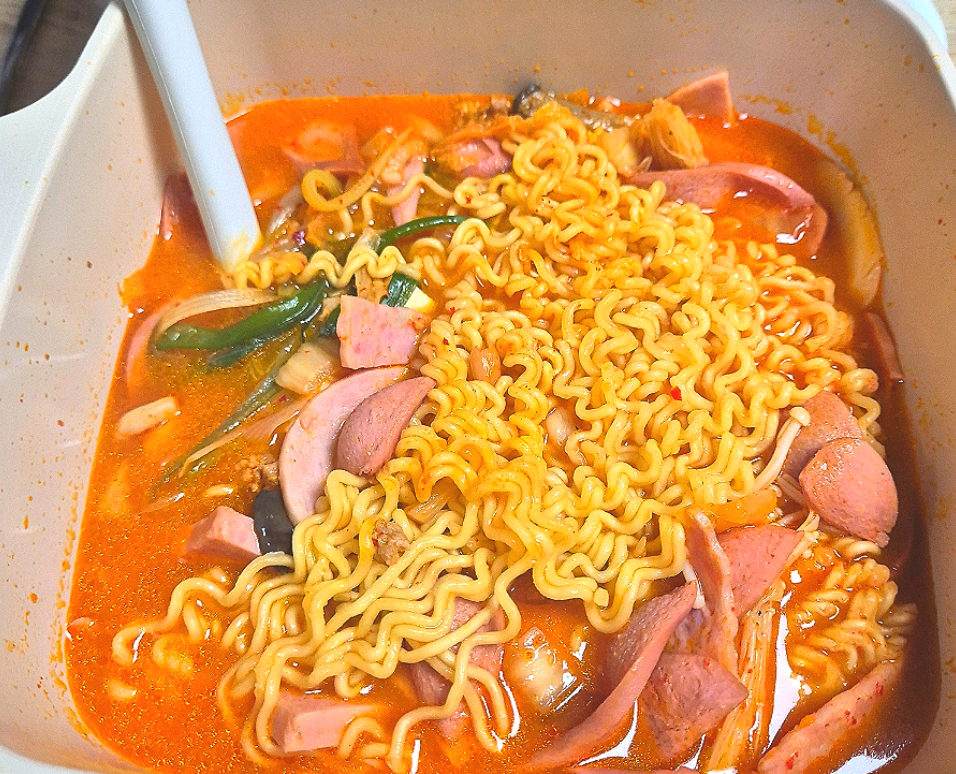 저렴한 가격으로 3인분이란 푸짐한 양을 재료도 다양하고 알찬 구성이면서 라면사리까지 먹을 수 있어서 든든한 포만감을 즐길 수 있는 가성비 부대찌개 맛집 땅스부대찌개를 소개합니다. 우선 햄과 소시지가 들어있는 봉투를 가볍게 뜯어서 넣어주는데요. 라면사리와 여러 가지 다양한 알찬 재료가 가득 들어있어서 그런지 매우 푸짐하게 보이는 먹음직스러운 비주얼이 매우 인상적이었는데요. 부대찌개 육수는 보통맛이라 그런지 전혀 맵지 않아 부담 없이 먹을 수 있었고 약간의 달달함도 느껴졌는데요.