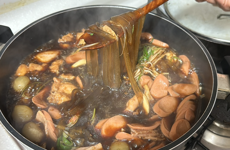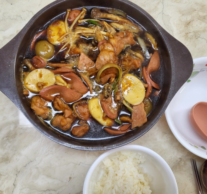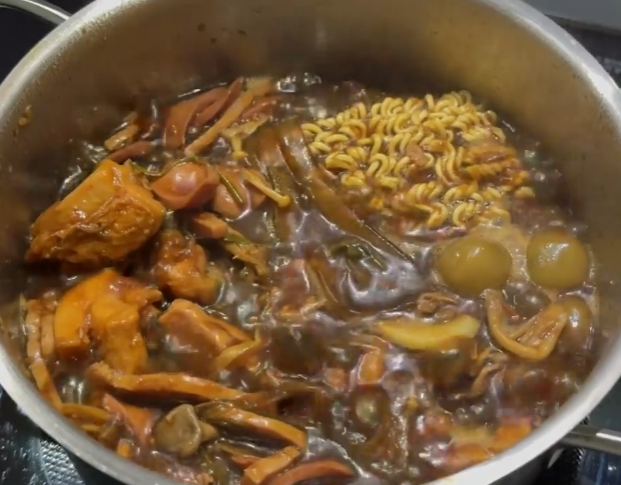 모든 재료들을 한군데에 모아두니 생각보다 양이 많아요. 3인분이 아니라 4인분 정도 되는듯ㅋㅋ 맛있는 검은찜닭 부대찌개가 완성되었어요. 찜닭이라 하기에 물이 좀 많고 부대찌개라 하기에 물이 좀 적고ㅋㅋㅋ 하지만 맛만 있으면 최고죠ㅋㅋ 닭도 냉동닭스럽지 않게 완전 부들부들하고 육수도 간장베이스가 잘 잡혀있어 완전 밥도둑이더라고요. 국물에 밥 비벼서 사리에다 먹으면 두그릇 뚝딱ㅋㅋㅋ