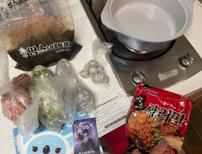 이제까지 테이크아웃하면서 몰랐는데 땅스부대찌개 일회요냄비를 팔더라구요? 땅스부대찌개 양이 꽤많아서 큰 전골냄비같은거 없으시면, 이거 구매하셔도 좋을거같고! 캠핑이나 어디 여행갈때 진짜 유용할거같아요 땅스부대찌개 3인분양이 다들어갈수있게 만들었다고하니 특히 여행갈때 함께 구매 필수일거같네요! 포장해서 나오는데, 깨알같이 봉투도 검은사막콜라보 봉투 넘나 귀여운거아니냐구요 육수 그리고, 순살닭고기, 각종 햄 사리 그리고 너무 귀여운 냄비받침이랑 게임 포토카드(쿠폰+경품응모권)이 구성되어있었어요 그럼! 쿠폰이랑 냄비받침은 오빠에게 선물해주고, 먹을 준비를 해봅니다 !