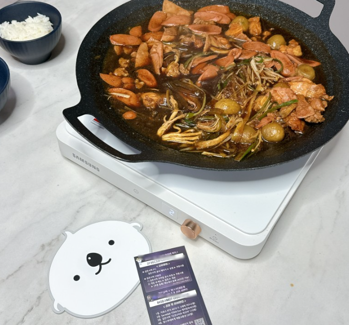 오늘은 퇴근하고 저녁 하기도 귀찮고... 뭐 먹지??뭐 먹지?? 고민하다가 땅스부대찌개에 방문을 했어요. 우리 삼형제와 함께 캠핑을 갈 때 포장으로 사가서 주로 먹는 땅스부대찌개인데.. 가끔 집에서 먹어도 굿굿이더라고요. 굿즈 냄비받침은 파푸와 크리오중 랜덤으로 제공이 된다고 하는데.. ㅇㅕNA가 받아온 거 크리오 냄비받침이더라고요. 넘나 귀여워~ 세팅후 가족들 모여라!!!!!! 찜닭에 햄과 야채 사리로 구성된 부대찌개 칼칼한 맛과 달콤함이 함께 어우러진 맛이에요.