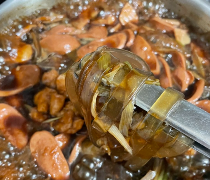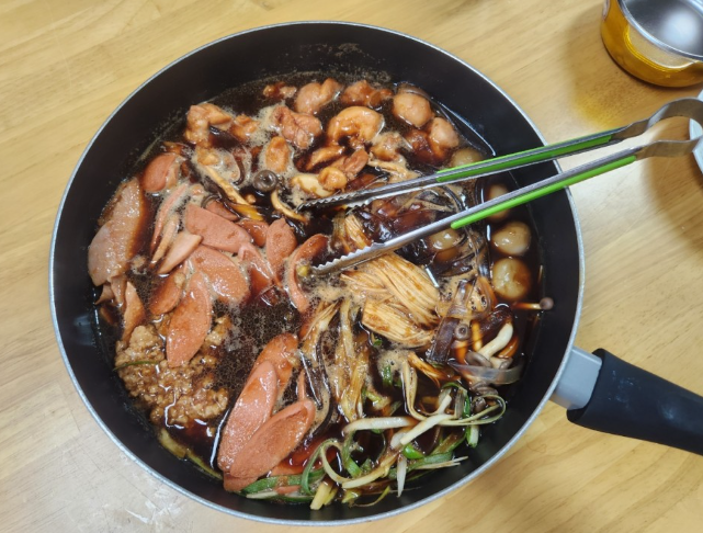 검은찜닭 부대찌개 (3인분) + 검은사막 콜라보 굿즈(냄비 받침) + 포토카드(검은사막 인게임 쿠폰 + 경품 응모권) 모든 재료를 냄비에 다 때려넣고 센불로 10분 바글바글 끓여준다. 국물이 사방팔방 다 튈 수 있으니 뚜껑 덮기! 그럼 진짜 맛있는 냄새 폴폴 풍기는 검은찜닭 부대찌개가 완성되는데 땅스부대찌개 오리지널은 먹어본적있지만 이렇게 찜닭 스타일의 신메뉴는 처음이라 너무너무 기대되서 흡입해버림ㅋㅋㅋ 부대찌개 스타일보다는 찜닭에 가까웠는데 남편이랑 진짜 맛있게 먹었다????????????????????????