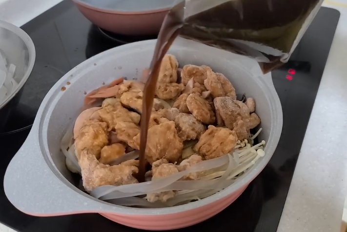 꺄~~!! 저는 게임을 하지 않아서 캐릭터를 잘 모르지만 북극곰인가요? 냄비받침을 보고 둥이들이 너무 귀엽다며 난리가 났답니다. 먼저 모든 재료를 궁중팬에 넣어보았어요. 주인공인 순살 닭고기부터 투하! 그런데 닭고기가 300g으로 양이 꽤 되었고, 무엇보다 순살이 큼지막한 것들도 있고 고기 두께도 튼실해 보였어요. 요 동그란 건 뭘까? 궁금했어요. 처음에는 떡인 줄 알았는데 나중에 먹어보니 꼬마 만두였지요. 아이들 한 입에 쏙 들어가는 크기여서 아이들이 먹기에도 좋았답니다.